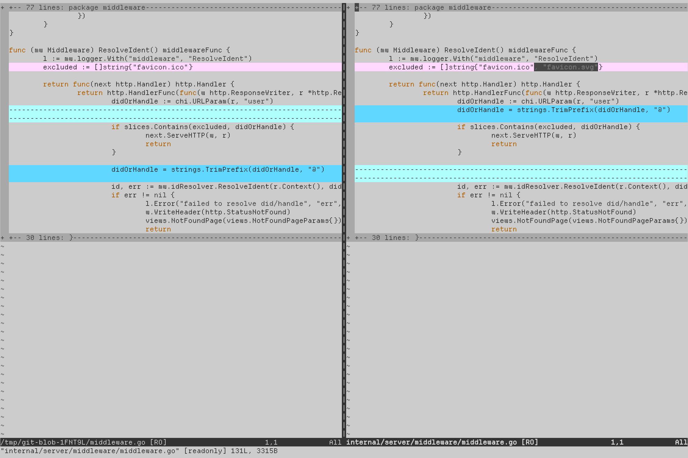 $ git difftool <remote>/<branch> --tool=vimdiffInstead of opening a long list of every change, git difftool opens the desired diff tool per hunk. It's much easier then to keep the surrounding context of the change in mind when reviewing.